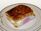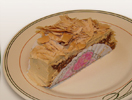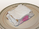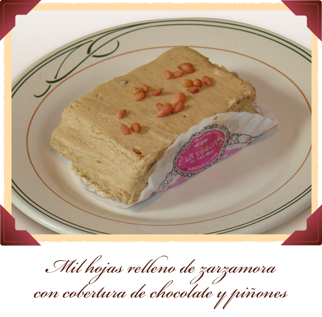 Mil hojas relleno de zarzamora concobertura de chocolate y piñones